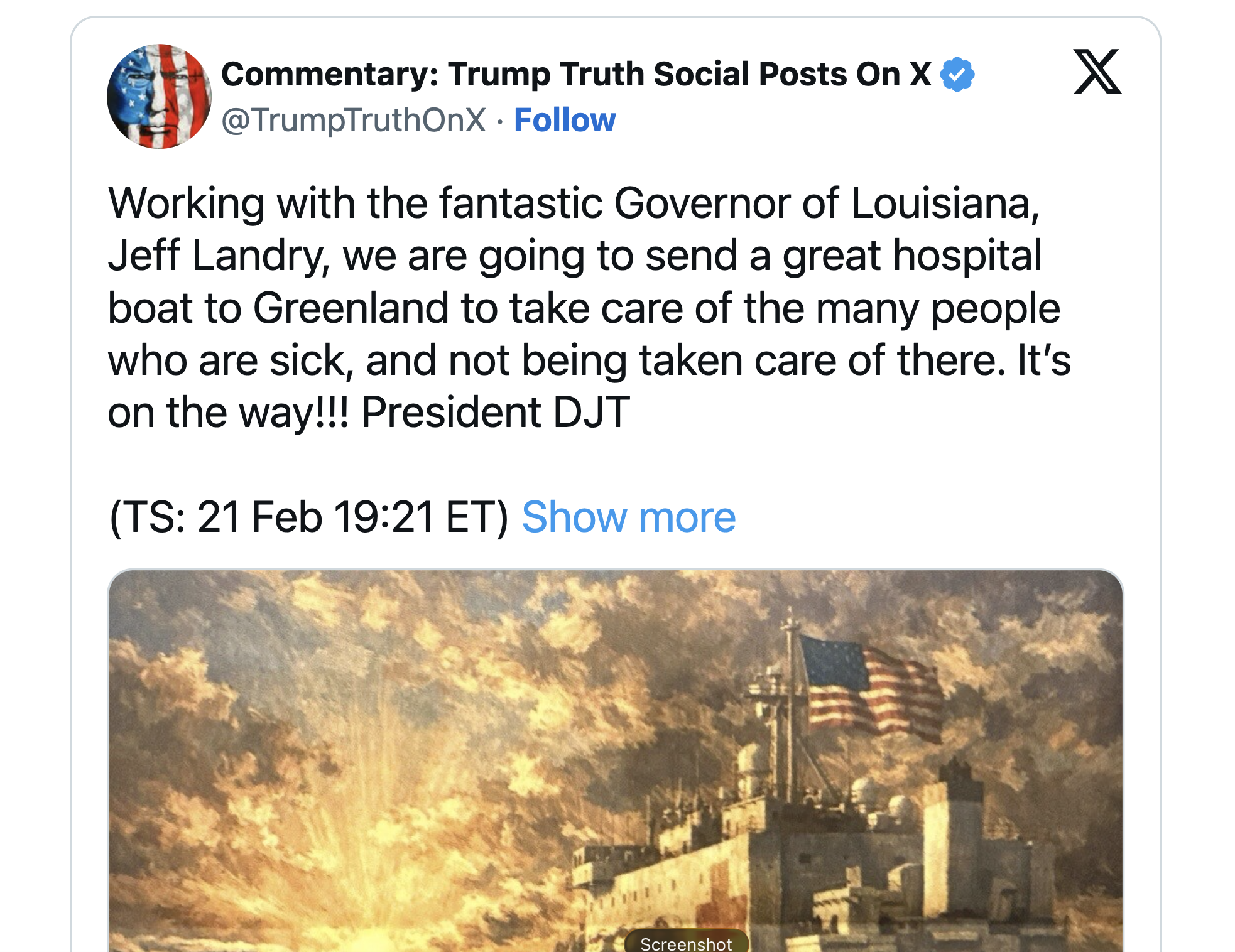 Trump, in a post on his Truth Social platform on Saturday night, referred to his special envoy for Greenland and said, “Working with the fantastic Governor of Louisiana, Jeff Landry, we are going to send a great hospital boat to Greenland to take care of the many people who are sick, and not being taken care of there. It’s on the way!!!”