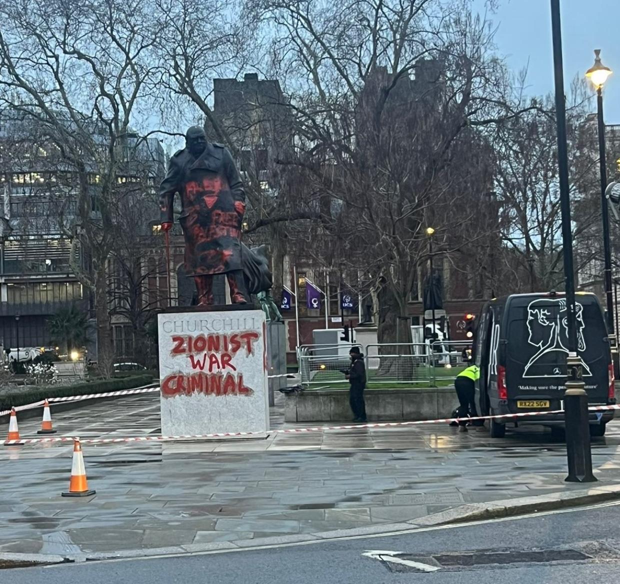 The words “free Palestine”, “Zionist war criminal” and “Globalise the Intifada” were written across the statue of the former prime minister in Westminster overnight.